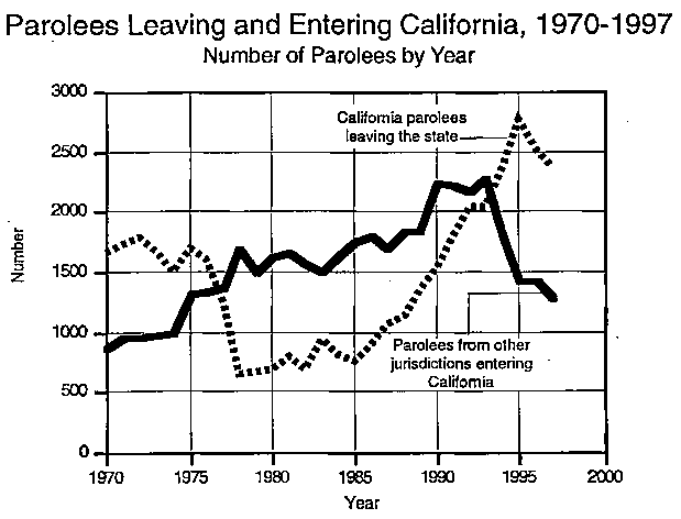 An unintended but positive consequence of �Three Strikes� has been the impact on parolees leaving the state. More California parolees are now leaving the state than parolees from other jurisdictions entering California. This striking turnaround started in 1994. It was the first time more parolees left the state than entered since 1976. This trend has continued and in 1997 more than 1,000 net parolees left California.38 |